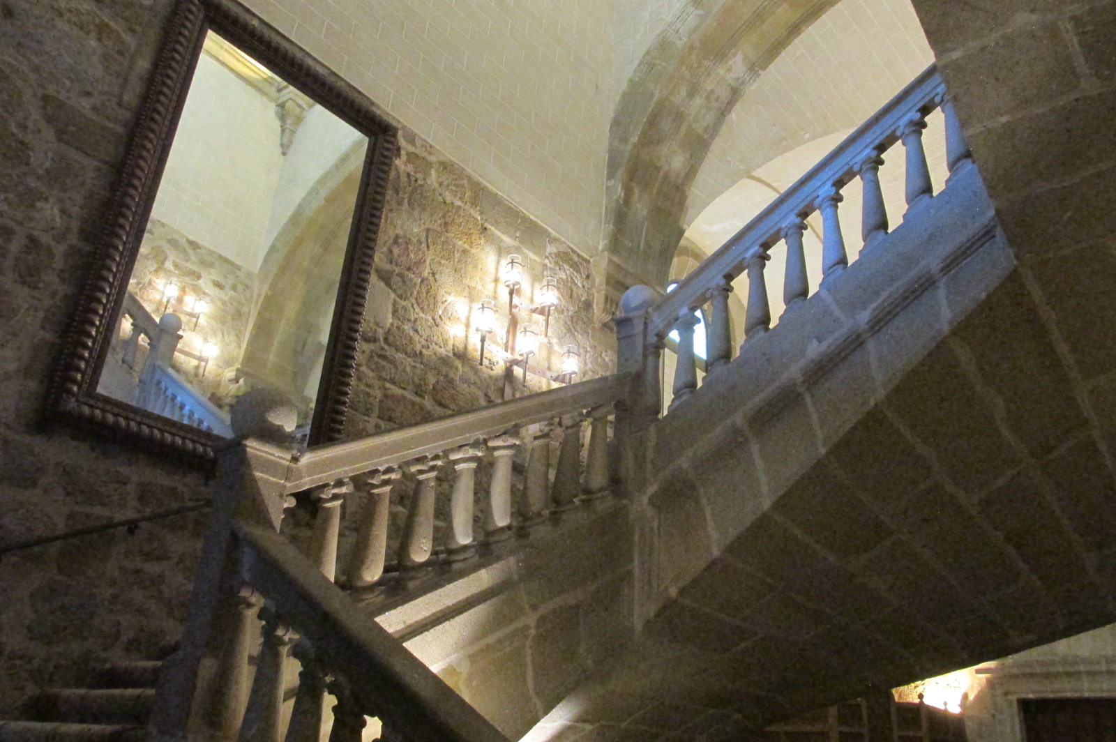 Esta escalera se encuentra en el recinto de la hoy cafetería del Parador Nacional de Plasencia.
